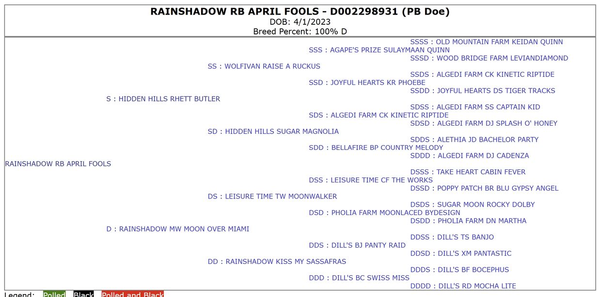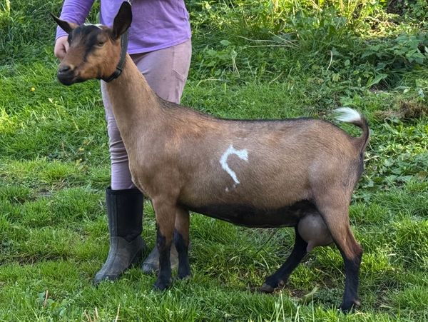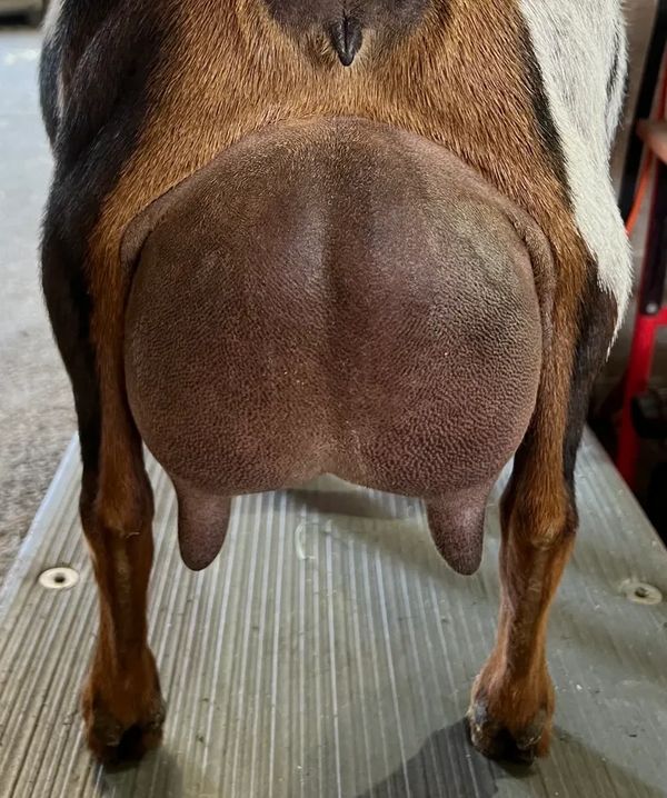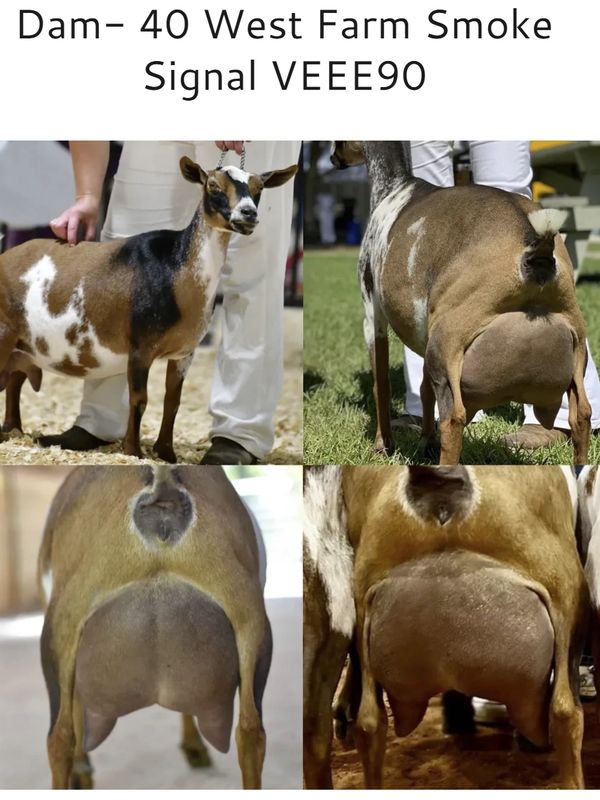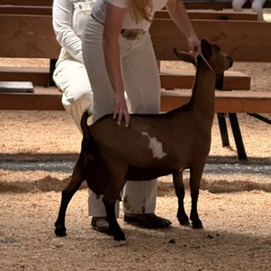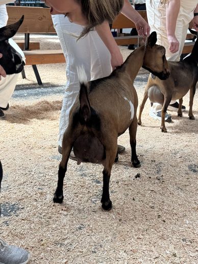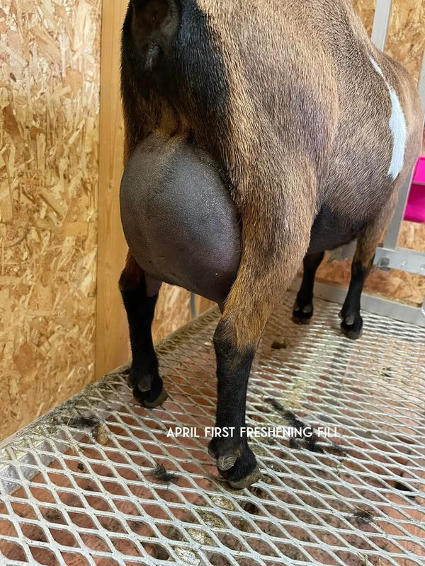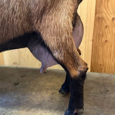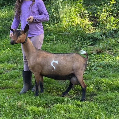 April came to our farm from Rainshadow Acres in 2023. She will be a 3rd freshener the first of the year, 2026, a wonderful milker with a good capacity udder. She produced quite a bit of milk her first year of milking and we are excited to get her her milk star this year and get her into the show ring. We love our April.